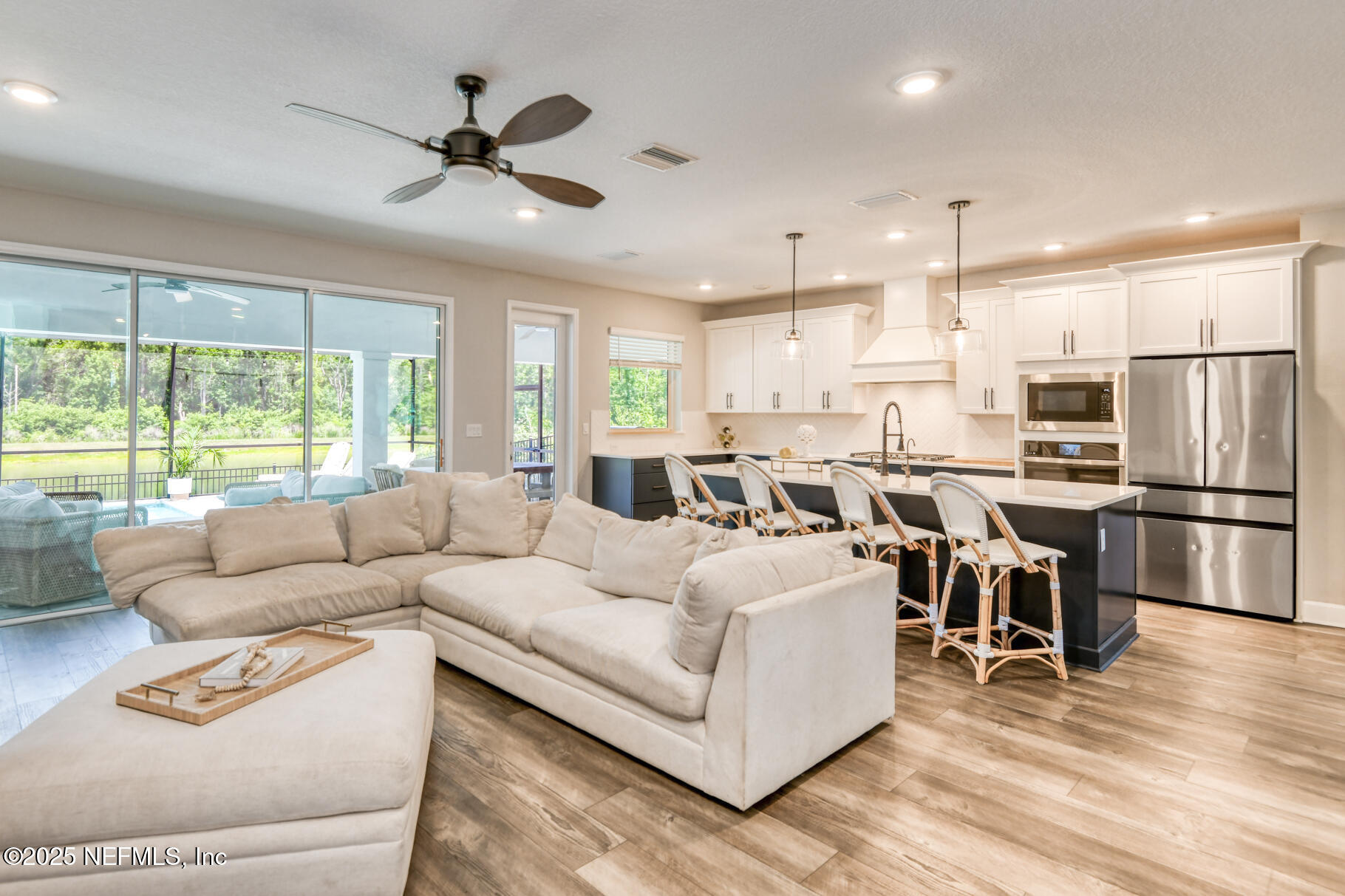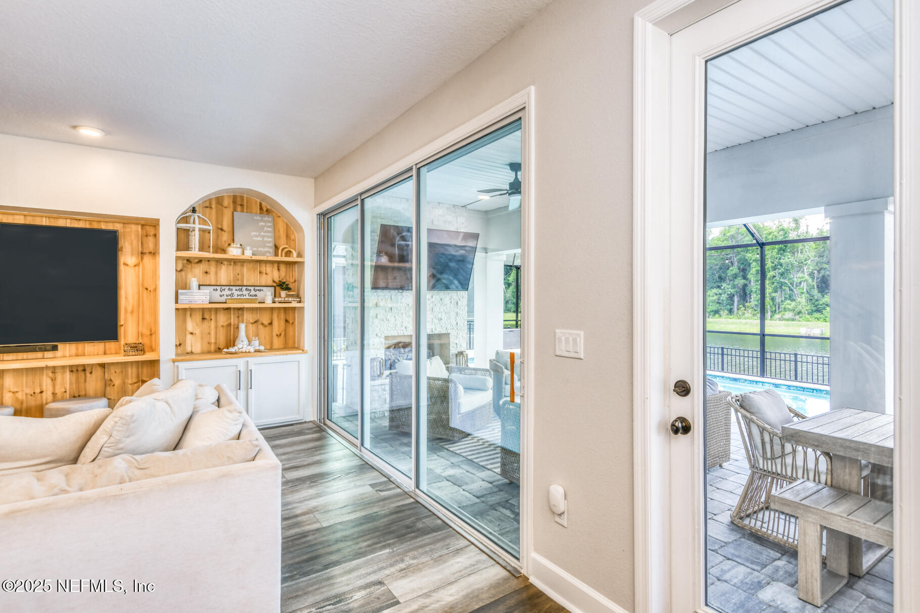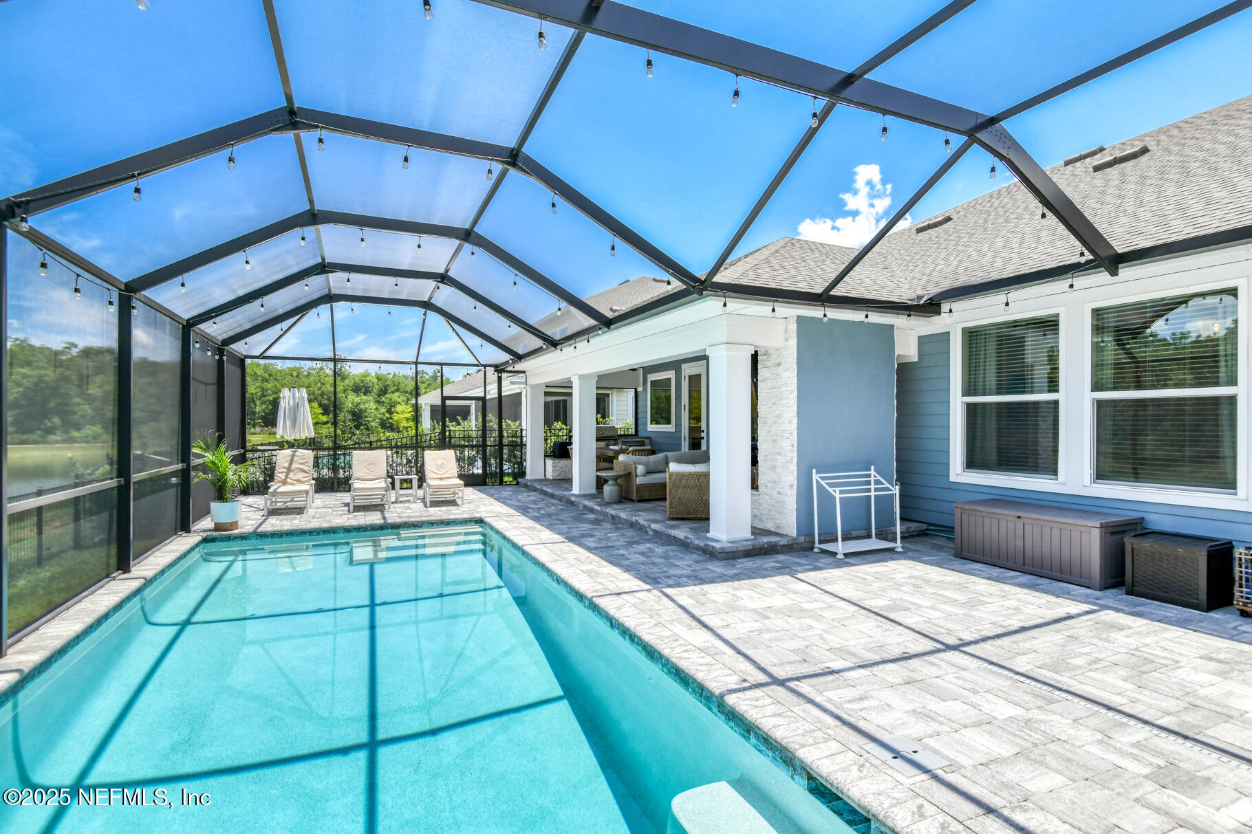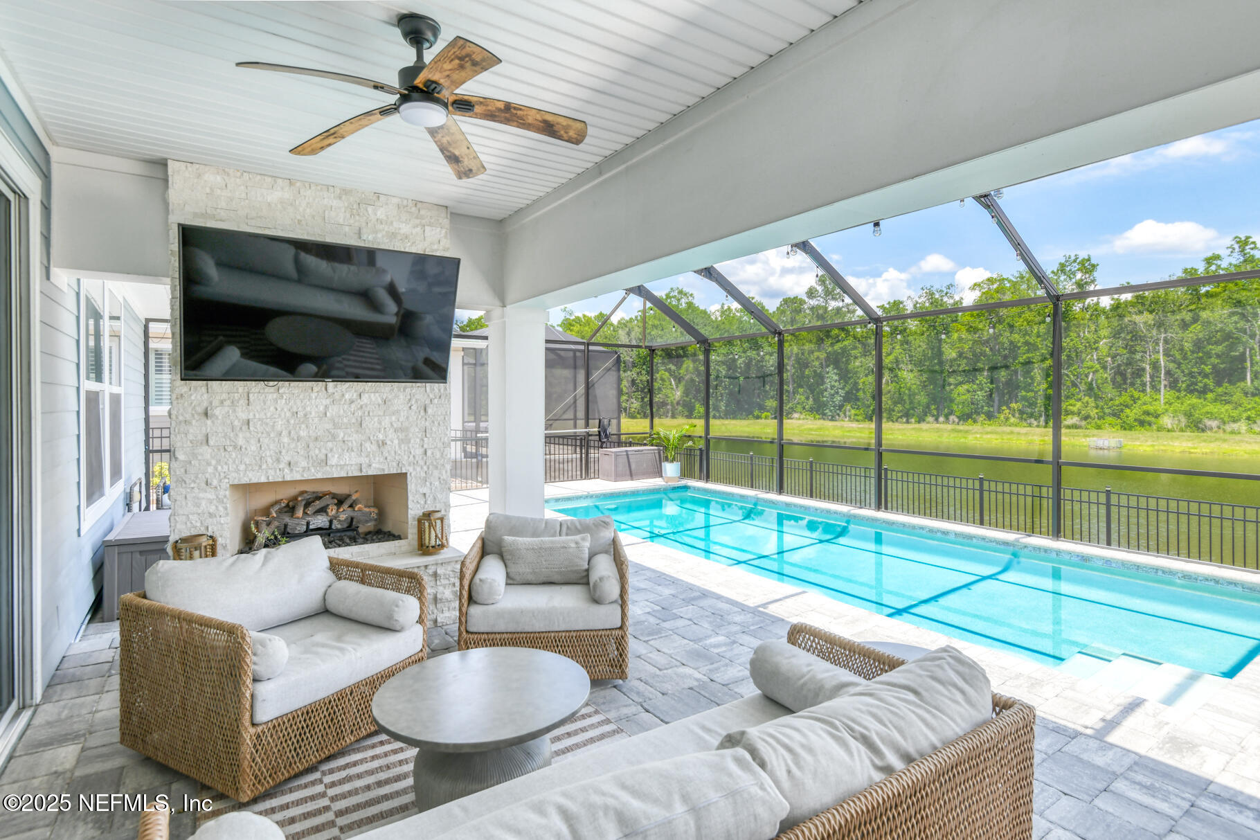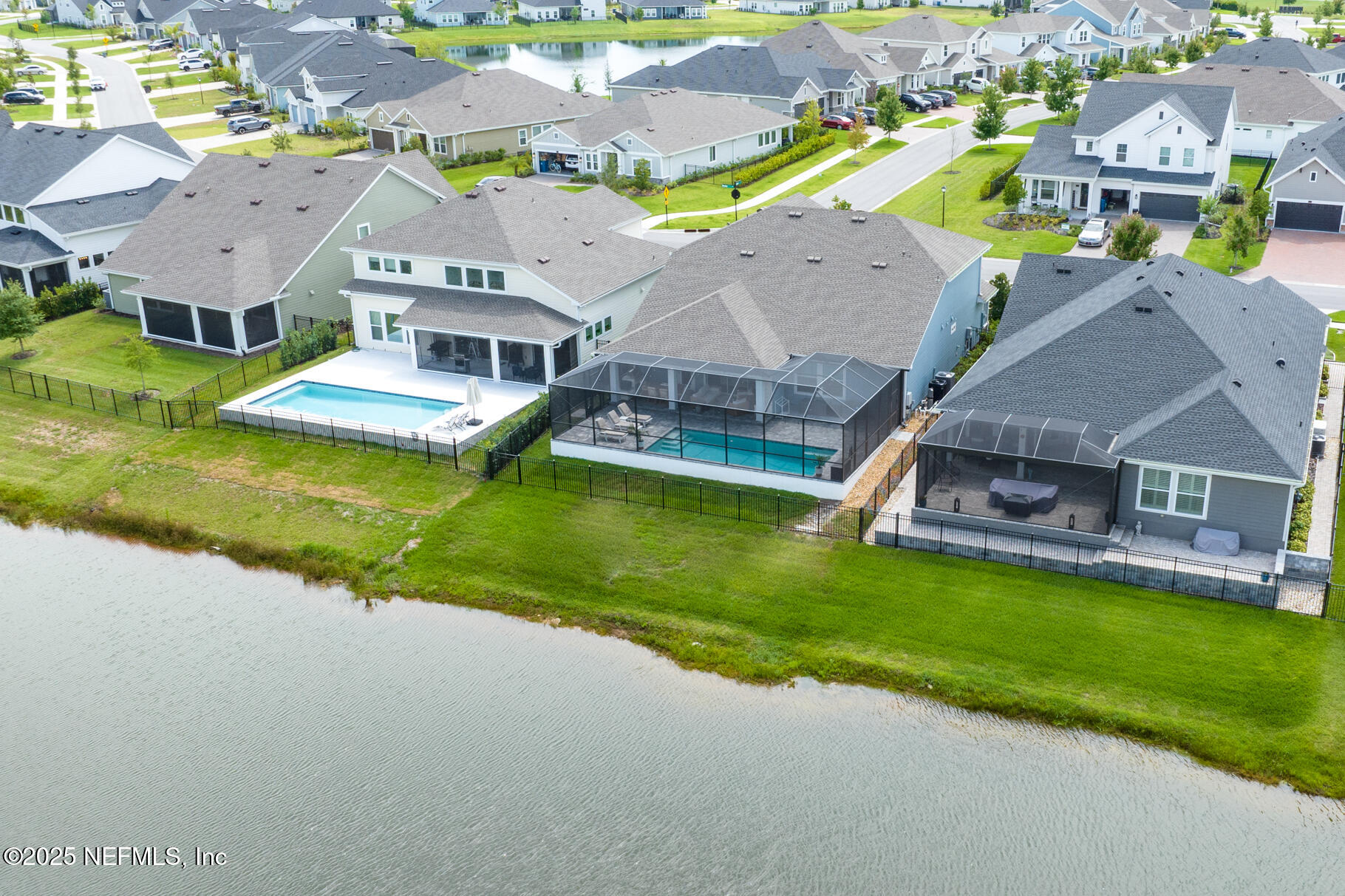 Exceptional 4BR/3.5BA pool home with screened in enclosure, plus office in the highly desirable Shearwater community. Features include 10' ceilings, recessed lighting, and wide plank LVP flooring throughout the main level. Family room includes pocket sliders opening to an enclosed paver lanai, with a built-in gas fireplace, outdoor kitchen, heated/cooled swimming pool and plenty of space to entertain. The fully fenced backyard overlooking lake and preserve offers some privacy. The primary suite includes a sitting area, walk-in closet with upgraded double shower heads. This home is beautifully designed by the home owner and an interior designer. Enjoy the many custom built-ins in the family room, lanai, primary closet , and mudroom. Upstairs, there is a large bonus room for entertaining and privacy for the kids. Seller may offer concessions towards closing costs.